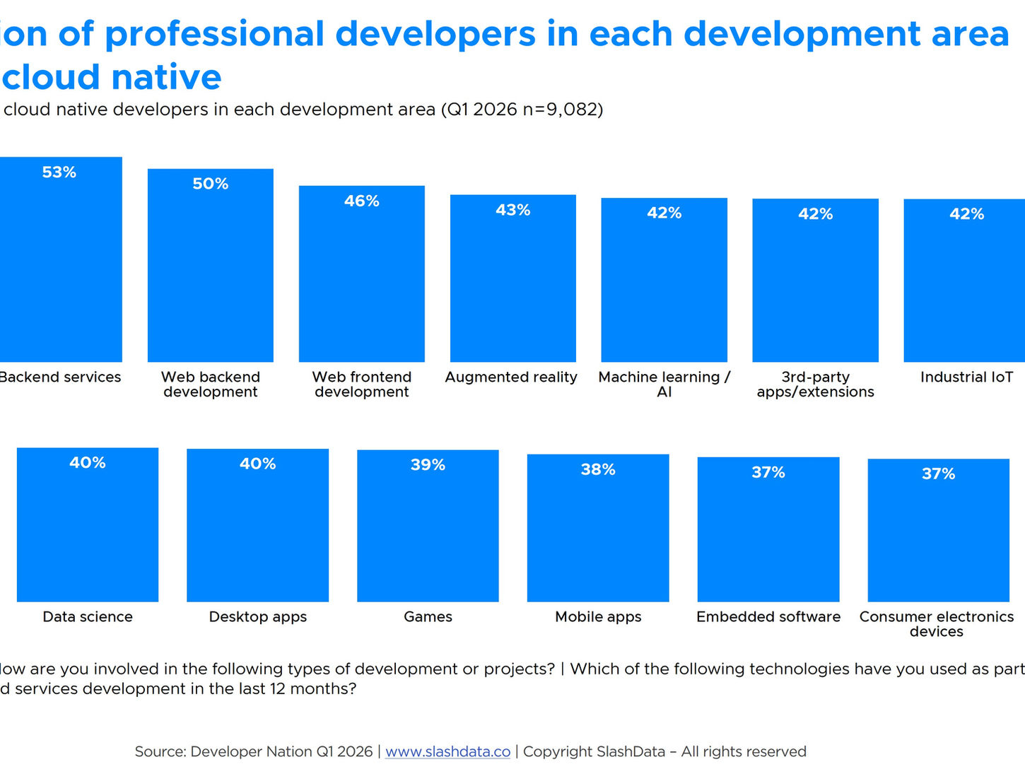 Cloud native adoption continues expanding, reaching 19.9 million developers (39% of all developers), though backend-specific adoption shows quarterly variation (52% in Q1 2026 vs. 58% in Q3 2025) while maintaining year-over-year growth. Platform engineering has reached critical mass, with 88% of backend developers now working with standardized infrastructure—a shift that increasingly abstracts underlying technologies like Kubernetes and containers from direct developer interaction.